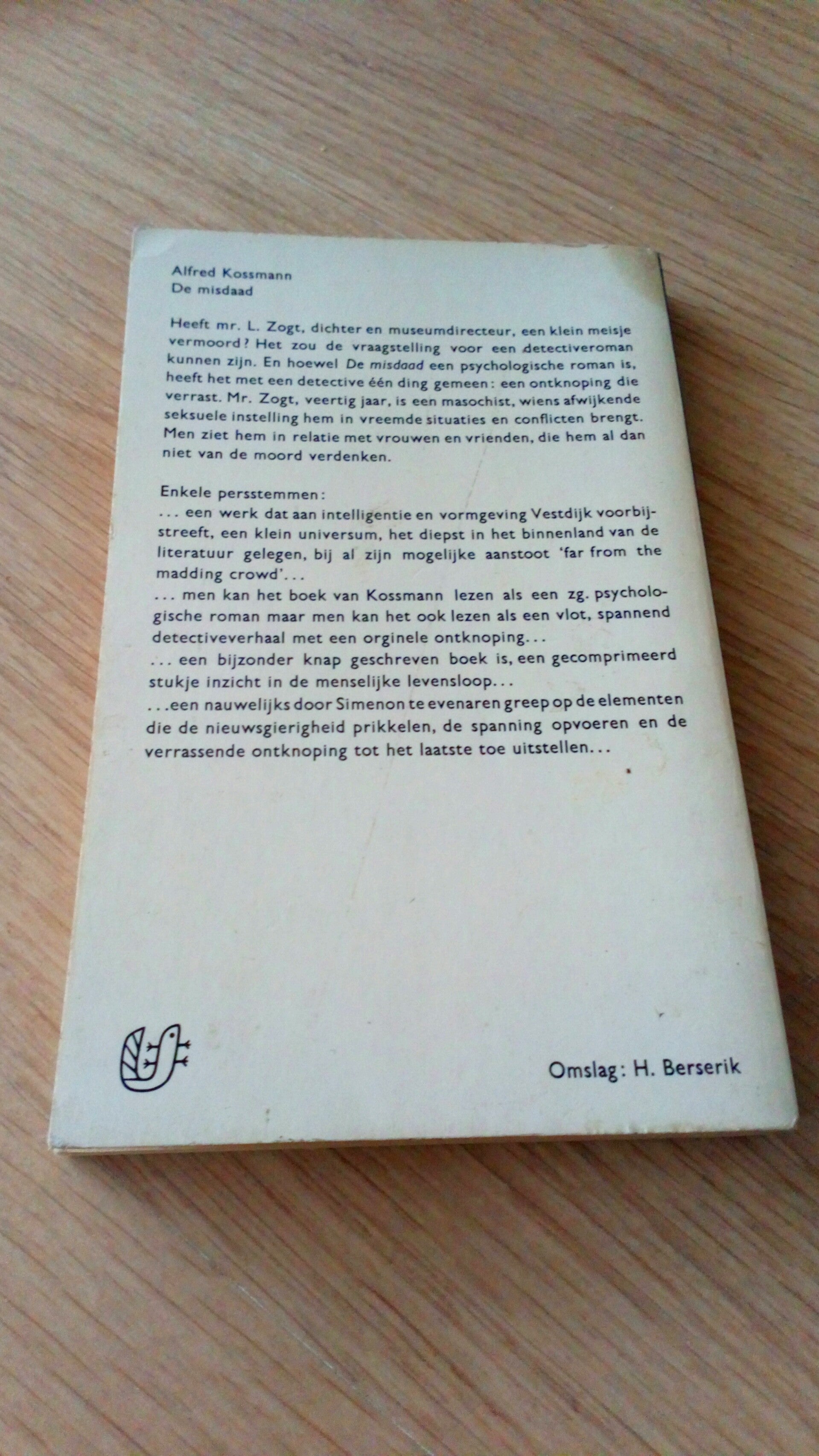 - Heeft mr L. Zogt, dichter en museumdirecteue, een kein meisje vermoord? Het zou de vraagstelling voor een detective roman kunnen zijn. En hoewel "De Misdaad" een psychologische roman is, heeft het met een detective één ding gemeen: een ontknoping die verrast. Mr. Zogt, veertig jaar, is een masochist, wiens afwijkende seksuele instelling hem in vreemde situaties en conflicten brengt. Men ziet hem in relatie met vrouwen en vrienden, die hem al dan niet van de moord verdenken.